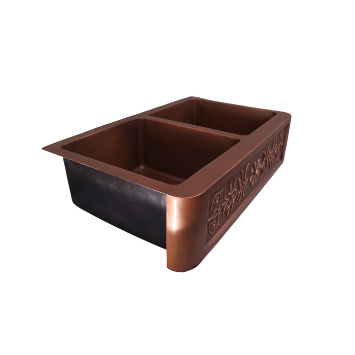 The Aqua Double Bowl Copper Apron-Front Sink combines durability with style, offering two spacious bowls perfect for food preparation. Its rounded corners allow for easy cleaning, while the finely crafted floral pattern on the front adds a decorative touch to your kitchen. Constructed from solid 16-gauge copper, this sink features a luxurious antique copper finish that will develop a beautiful patina over time.